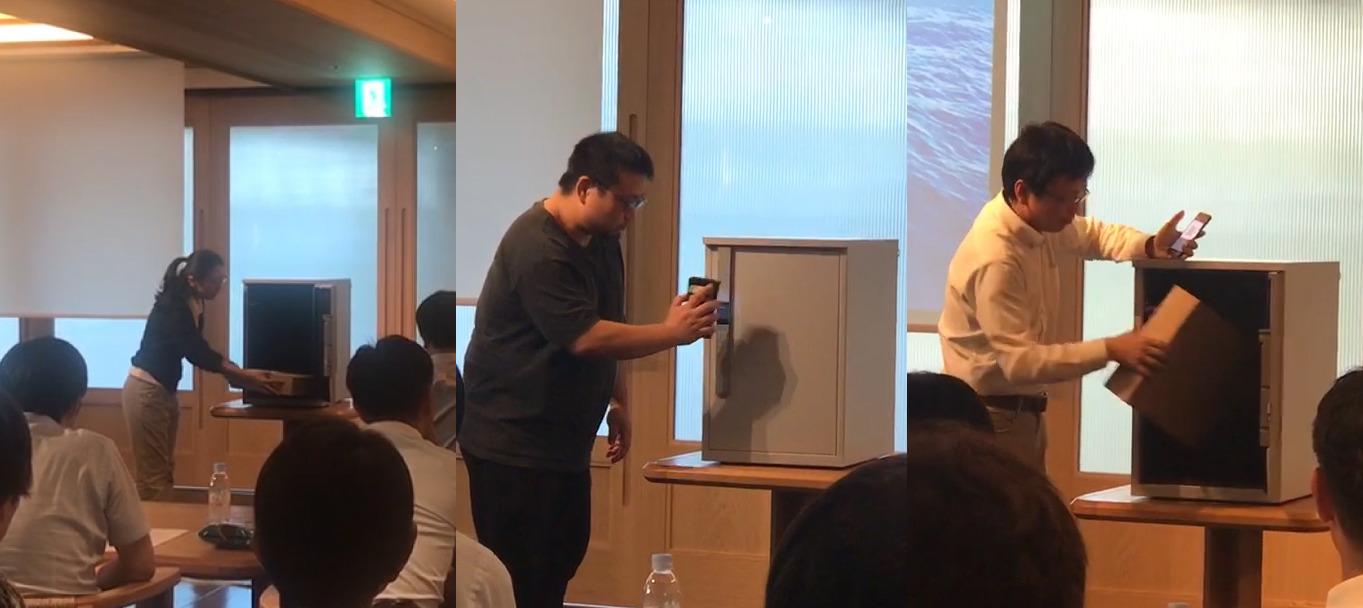 発表会では本製品のデモンストレーションも行われました。本製品の基本操作である「配送事業者のボックス解錠・荷物投函」「利用者のボックス解錠・荷物受取」は、操作の簡単さと、安心・安全面の高さが来場者の注目を集め、メディア各社にも本製品の目玉ポイントとして取り上げられました。発表会ではサービス事業者を介さない個人間荷物の受け渡し(投函・受取)、同一ボックスによる 2 個目の荷物の投函・受取も実演しました。個人間荷物の受け渡しは、既存製品にはない新しい機能です。本機能は、近所や同じ集合住宅に住む居住者同士の物々交換ツールとしても活用が期待されます。