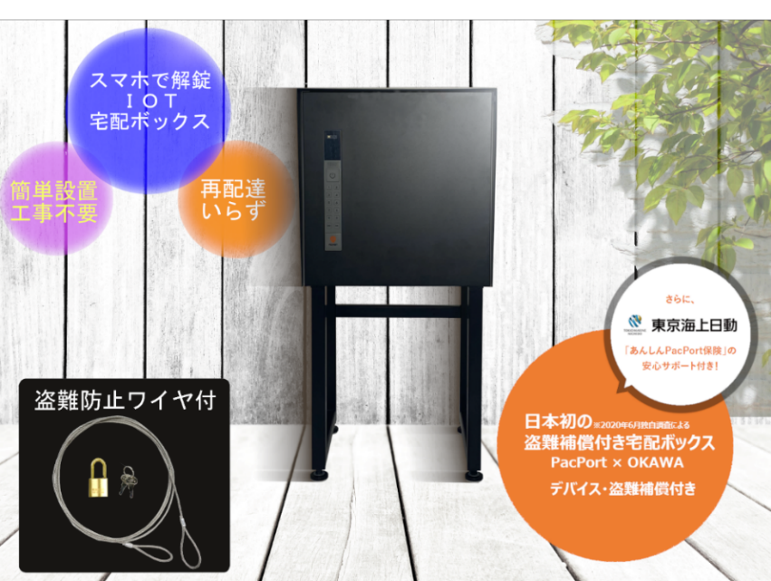 また、当キャンペーンの対象商品には、PacPort が建築資材の製造販売を行う OKAWA と共同開発した、国内初※1の「盗難補償付き」※2戸建て住宅向け IoT 宅配ボックス(置型タイプ)を採用しています。設置工事不要、無線 LAN 環境(Wi-Fi への接続)が整備された場所に設置するだけで即時使用可能です。