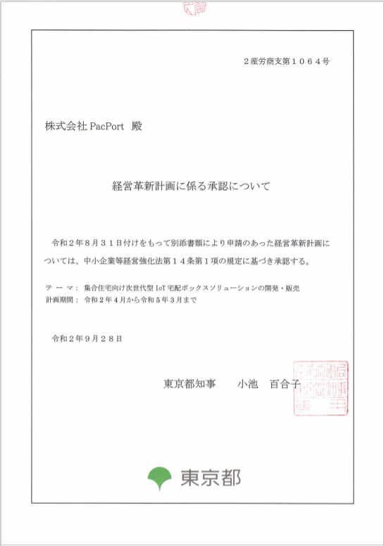 弊社事業の新規性及び実現性が東京都に評価されましたことを励みに、引き続き「再配達ゼロ」を目指して精進してまいる所存です。