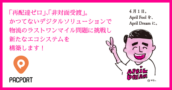 まもなく設立 3 周年を迎える PacPort の April Dream は、自社の企業理念でもあります。変わり続ける人々の働き方やライフスタイルを支援する物流エコシステムを創出するとともに、再配達率を下げることによって CO2 排出量の抑制にも大きく貢献します。今後も多くの企業との協業のもとで、「再配達ゼロ」を実現するための新しい物流エコシステム作りに真摯に取り組んでまいります。