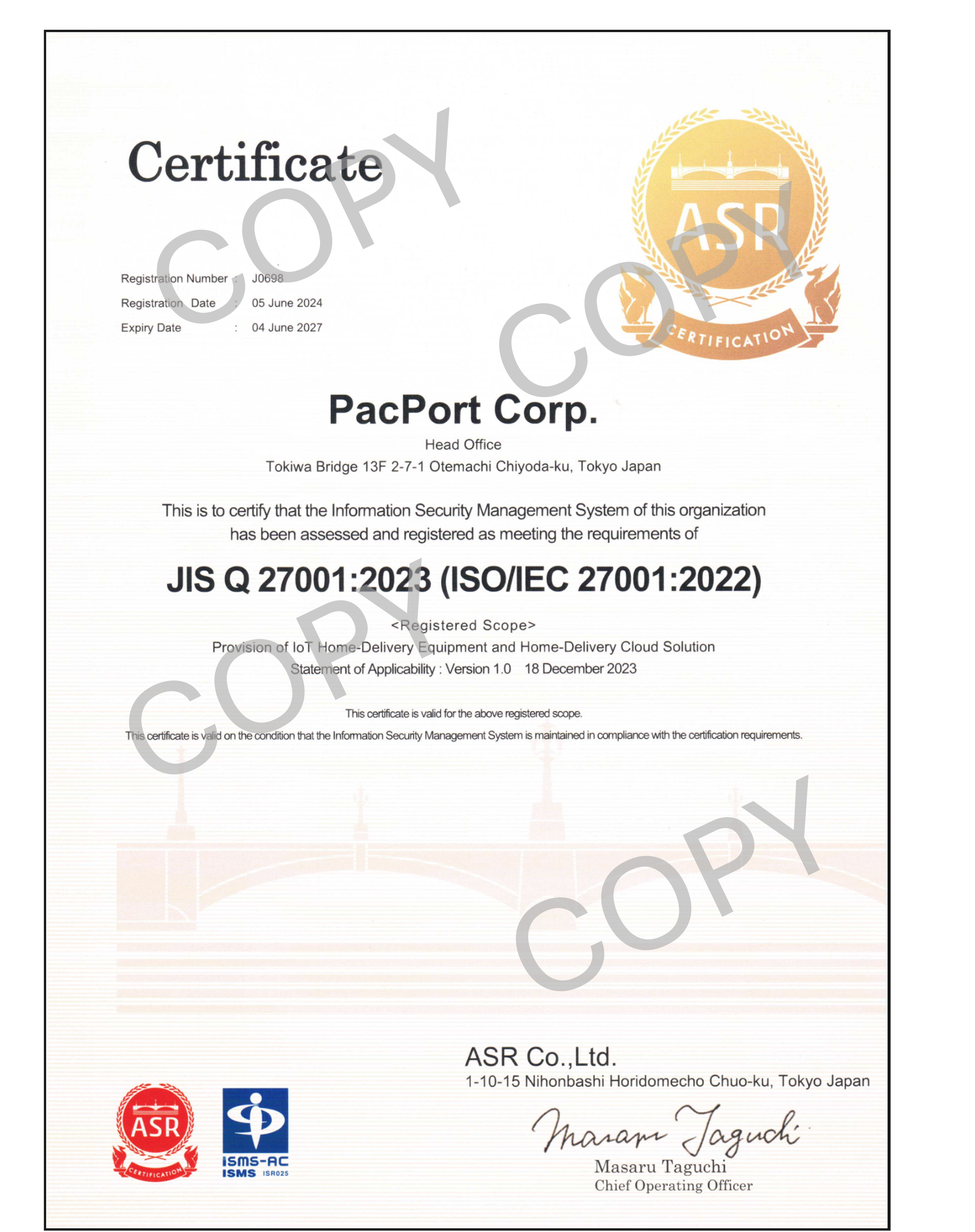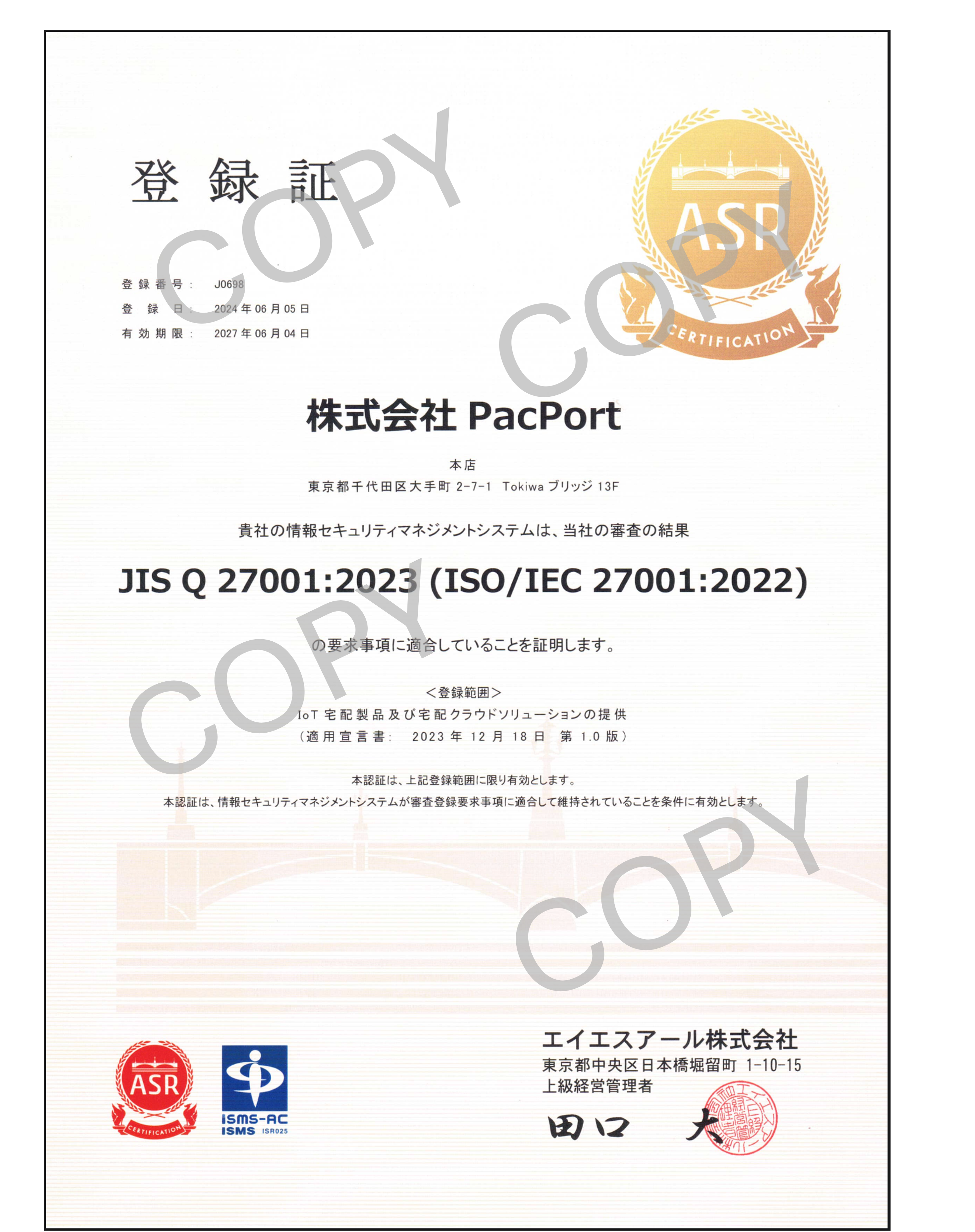 当社のIoT宅配製品及び宅配クラウドソリューションにおける情報セキュリティマネジメントシステム(ISMS)が国際規格ISO/IEC 27001の認証を受けたことをご報告いたします。